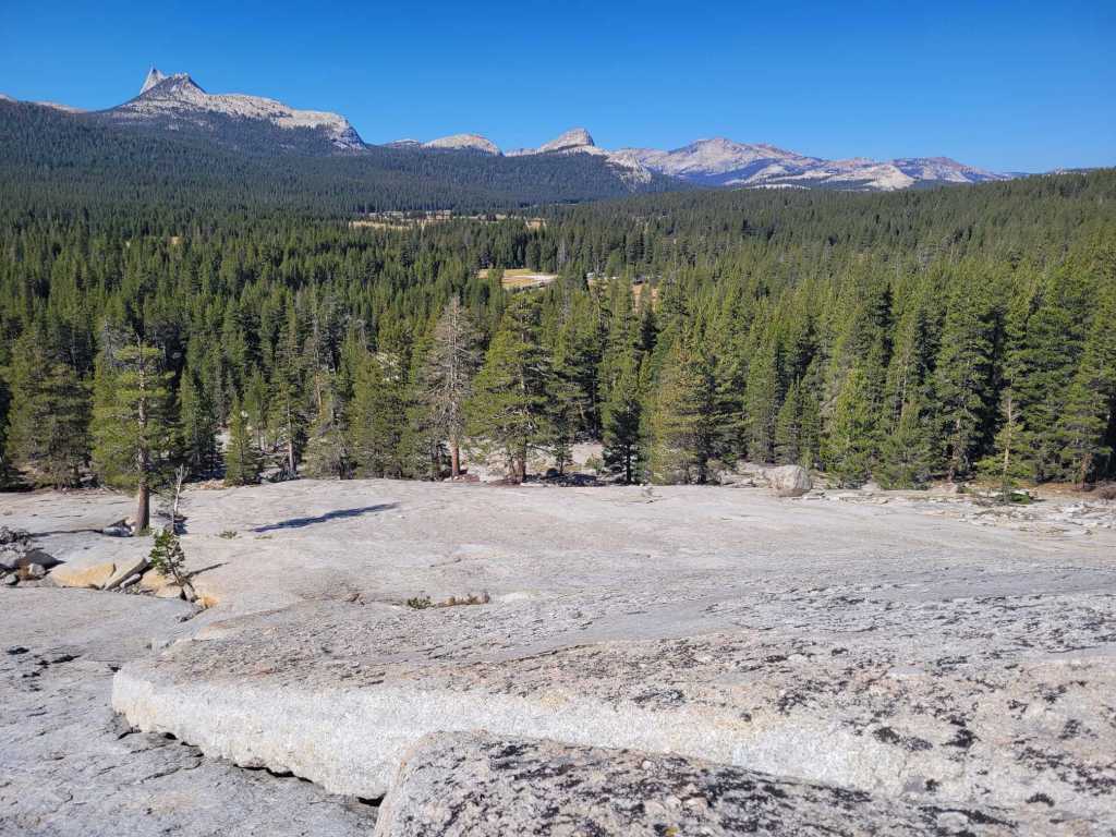 Got up early to grab a coffee, and headed up the last few miles in to Yosemite. Very quiet here, nobody around, since all the facilities got destroyed over a brutal winter and they are rebuilding for the next year or two. But, the granite cliffs and domes are still here. I climbed part way up Lembert Dome but of course I forgot water and sunscreen and — oh! — climbing gear, ’cause that’s just how I roll, and so I didn’t make it past the first bolt hanger. It was glinting at me in the sun, calling me higher on the cliff face, but it will have to be another time.