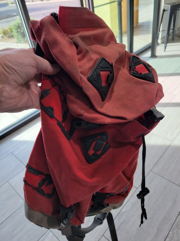 Sadly, I had to say goodbye to my favorite crag pack (also ca. 1985) the other day. It had been attacked by swarms of squirrels at Swan’s Slab. It had been dragged up and down Half Dome a half-dozen times. It had dutifully carried books and groceries and every theme and variation of outdoor gear. But, in the end, some of the stitching was ripping out, the strap padding was long gone, and the plastic buckles and attachments were crumbling.